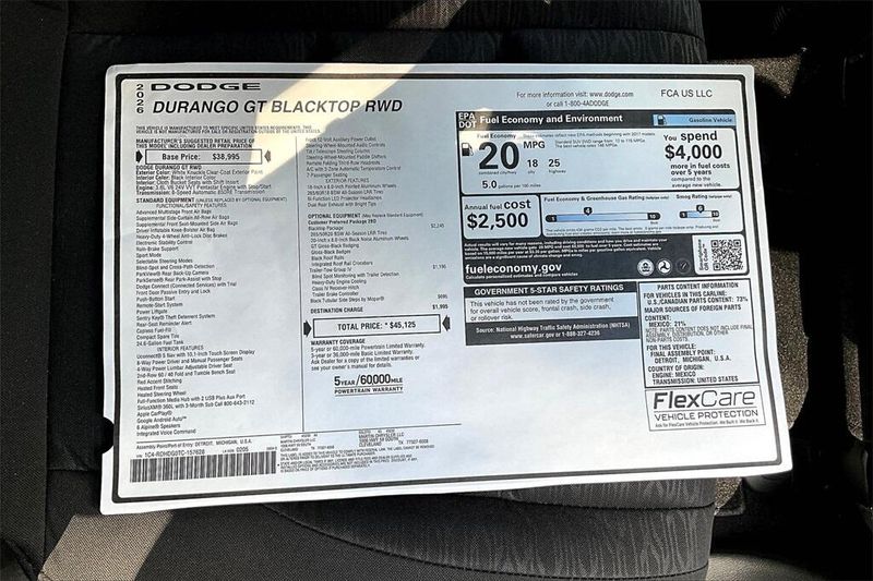 White Knuckle Clearcoat 2026 Dodge Durango GT RWD 8-Speed Automatic 3.6L V6 24V VVT Prices do not include Tax, Title, License and Documentary Fee. Price does include: $1000 - 2026 National Engine Retail Bonus Cash . Exp. 11/03/2025